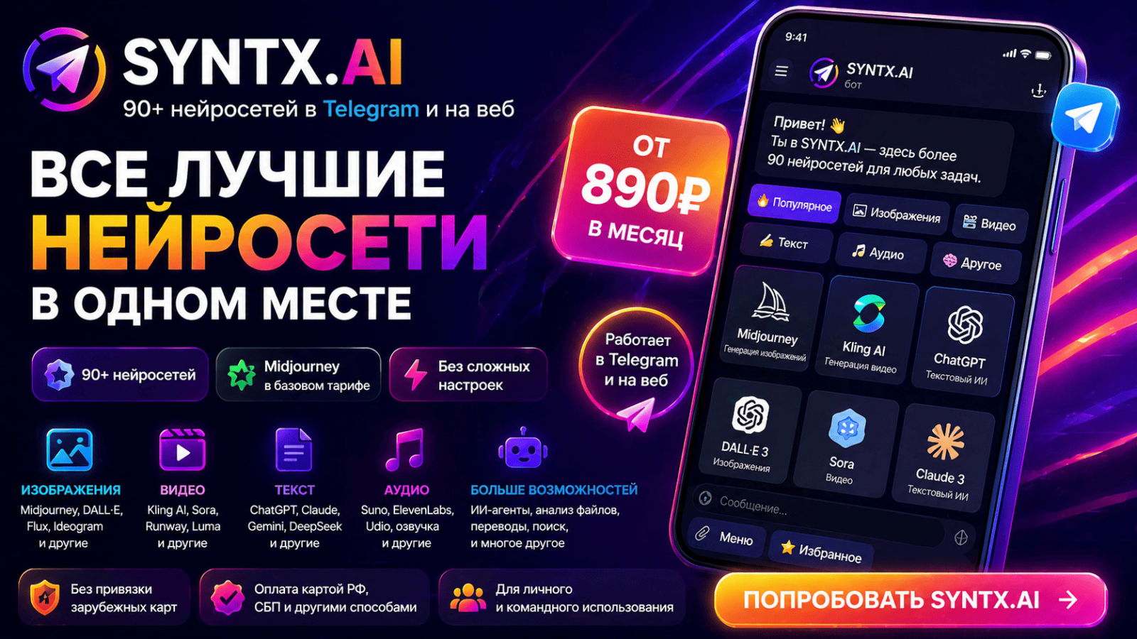 SYNTX.AI — агрегатор нейросетей с акцентом на работу через Telegram.