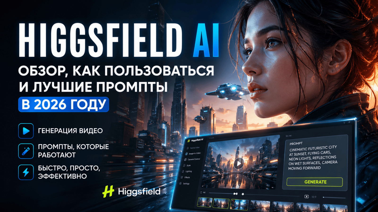 ➡️ Пример: cinematic shot of a futuristic city, neon lights, rain, camera slowly moving forward