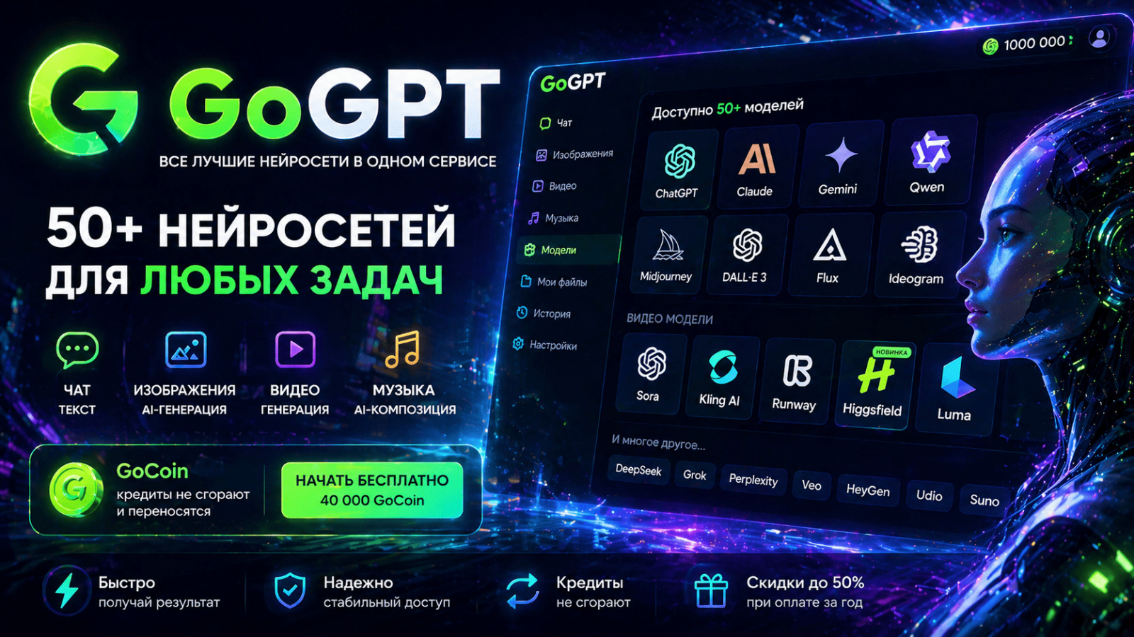 Подойдут платформы с большим выбором нейросетей, например GoGPT — удобно сравнивать Higgsfield с другими инструментами.
