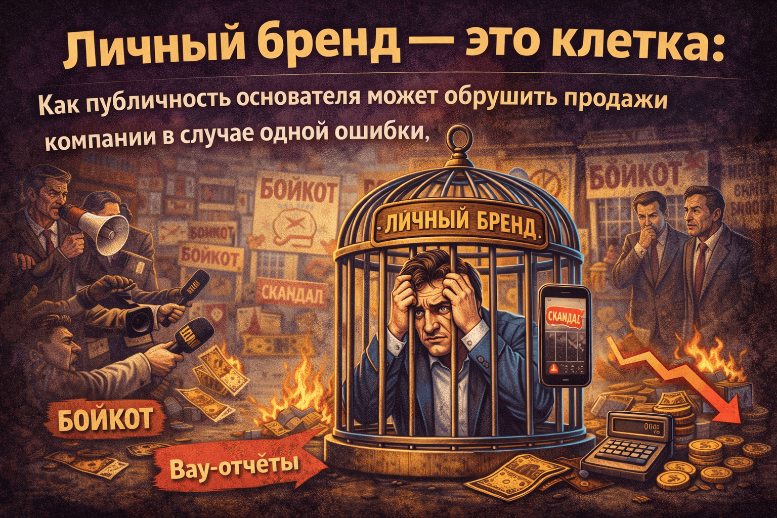 Мы живём в эпоху культа основателей. Илон Маск, Стив Джобс, Дуров, Тиньков — их имена стали синонимами их компаний. Нам внушили: «Личный бренд — это твой золотой парашют, твоя защита от кризисов, твой главный актив». Тысячи предпринимателей послушно лезут ВКонтакте, Telegram, YouTube, оголяют душу, рассказывают о детских травмах, показывают завтраки и становятся «ближе к клиенту». Маркетологи твердят: люди покупают у людей, а не у безликих корпораций.