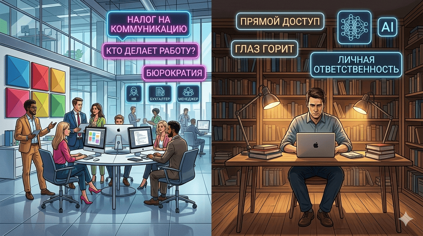 Теперь посмотрите на модель соло-игрока высокого уровня. Это играющий тренер. Он не перепоручает задачи загадочным ребятам в бэк-офисе. Он сам садится и делает. Он сам держит стратегию в голове и сам же воплощает её в макете, тексте или коде. Между замыслом и реализацией нет разрыва. Нет эффекта испорченного телефона, когда менеджер неправильно понял брифинг, передал его дизайнеру, тот сделал не то, а креативный директор утвердил, потому что не вникал.