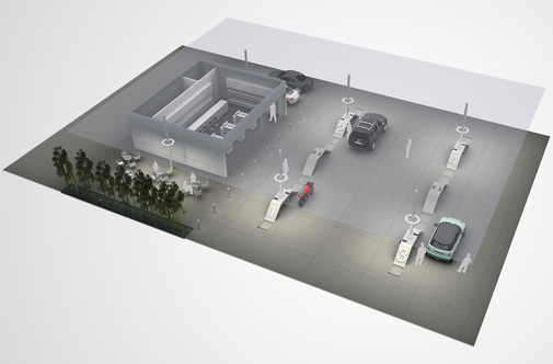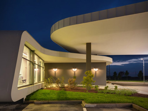 Дорожное полотно не прерывается на АЗС, а загибается в причудливую форму, обретая новую функциональность, а потом, так же плавно переходит обратно в дорогу.
