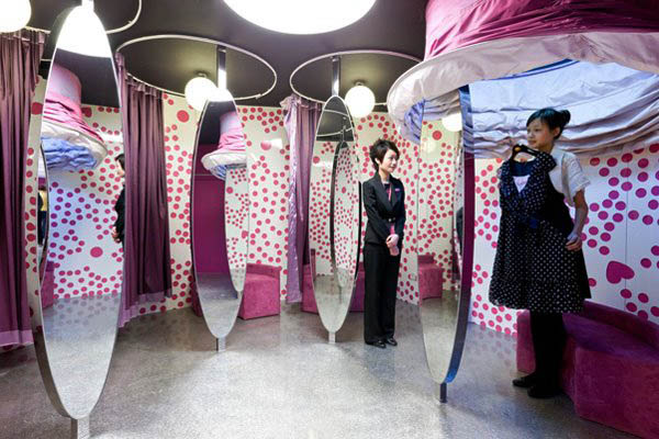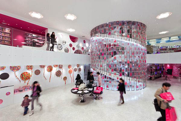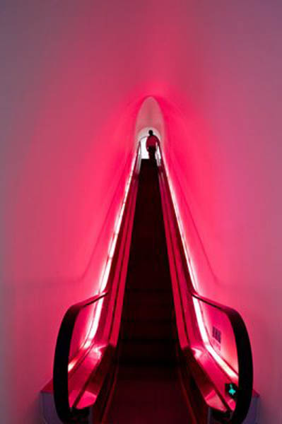 Розовый эскалатор засасывает клиентов на двух- уровневое торговое пространство.