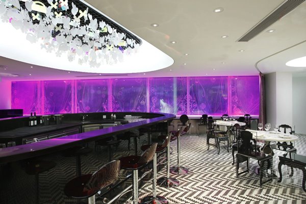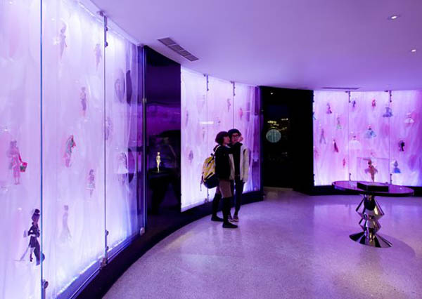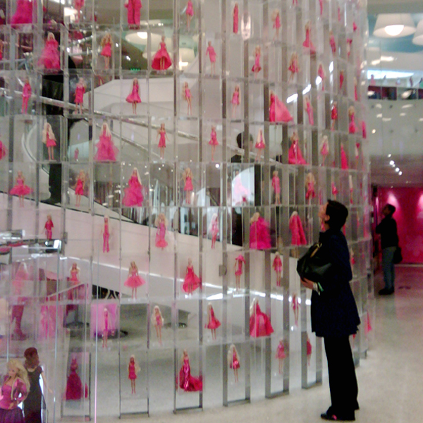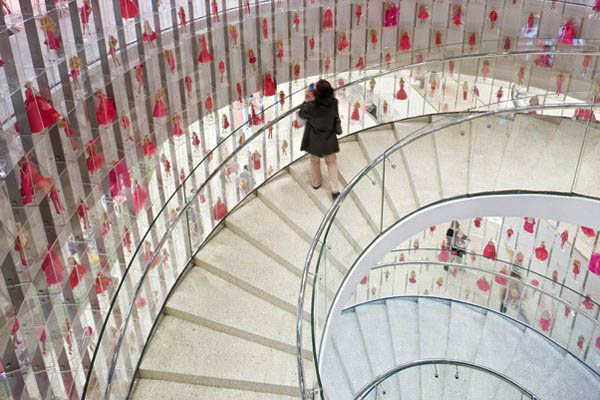 Трех- этажная винтовая лестница, окутана прозрачной стеной с 800 куклами Barbie, рассказывая хронологию развития бренда.