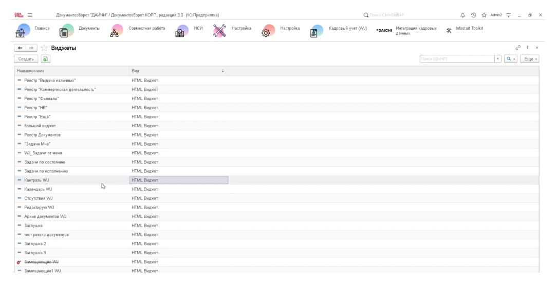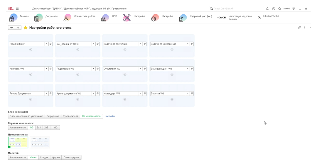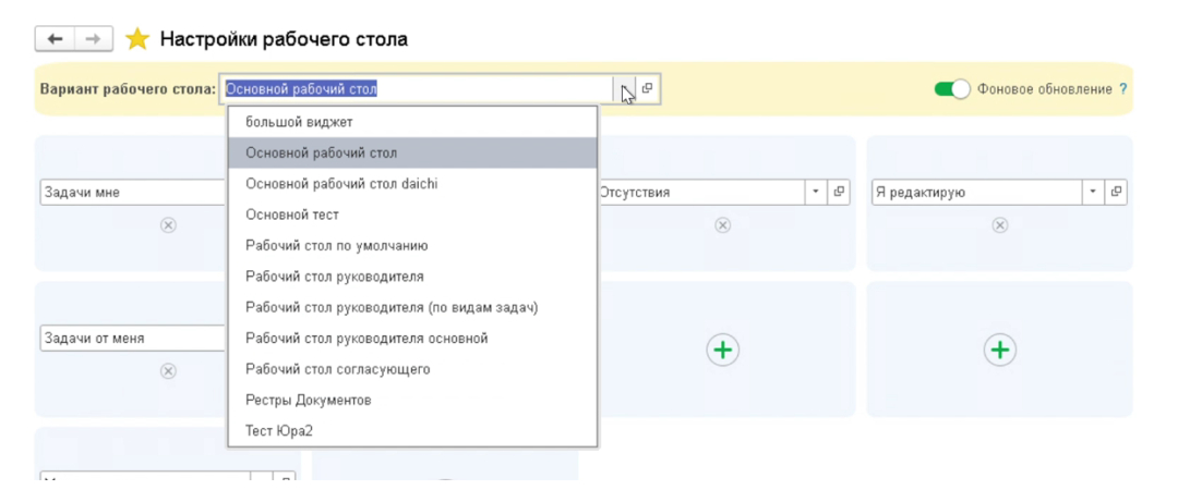 В работе столкнулись с проблемой хранения данных. Системе нужно где-то хранить состав нового рабочего стола, чтобы создавать наборы кастомных виджетов. Мы сделали вариант рабочего стола в реестре документов, можно по кнопке переключиться на него. Штатный рабочий стол также доступен пользователю для работы.