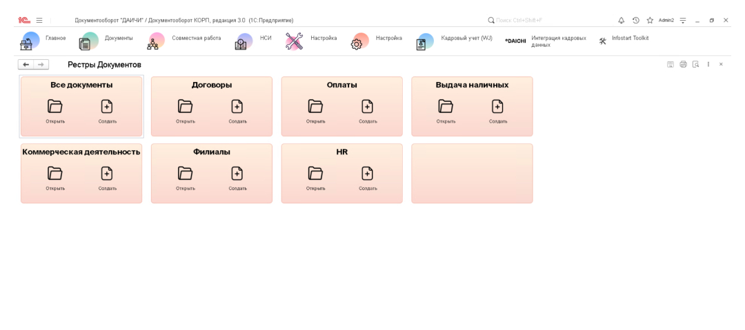 Пользователю доступны градиентные кнопки (виджеты). Работает иконка, позволяющая открывать и создавать элементы. Если мы откроем виджет «Все документы», запустится форма списка документов. Можно перейти в документы по коммерческой деятельности, создать новые, например, договор.
