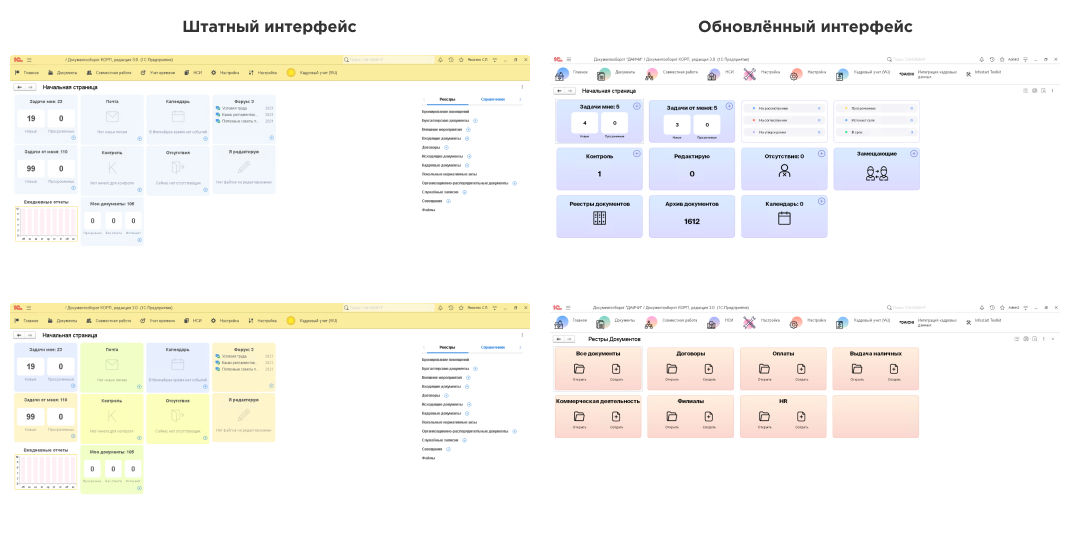 Заказчик решил настроить продукт под точечные запросы команды с точки зрения управления функциями и дизайном системы. Он поручил нам создать кастомный корпоративный интерфейс для 1С: ДО.