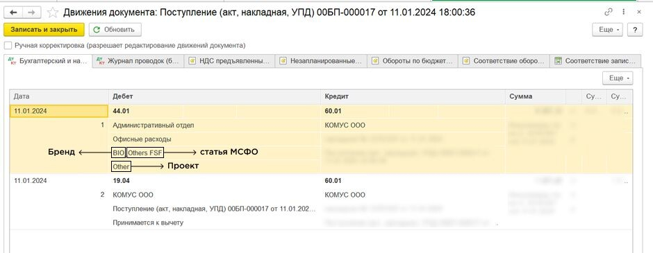 В системе «Бухгалтерия 3.0» уже были продуманы справочники для сбора по Брендам и Проектам с использованием Субконто №3 и Субконто № 4 по 44 затратному счету в БУ. Что значительно сократила время настройки правил для перекладывания данных на счета МСФО.
