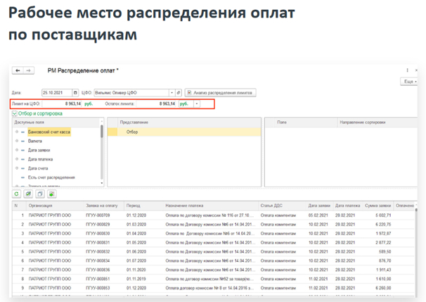 В компании существует большой пул поставщиков, по которым необходимо отслеживать выделенный лимит оплат. Для этого в ERP-системе было выделено отдельное рабочее место. Данное рабочее место позволяет руководителю ЦФО ДФ и ВиО распределять суммы по заявкам в рамках выделенного лимита. Распределенные лимиты автоматически попадают на технический счет в платежном календаре для дальнейшего распределения оплат.