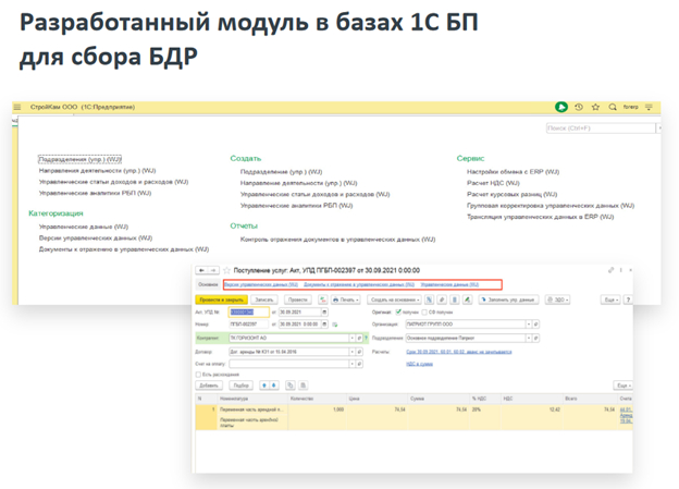 Был разработан отдельный механизм сбора фактических данных в разрезе управленческих аналитик в базах УТ и бухгалтерских базах – по уже настроенной трансляции данные загружаются в ERP и трансформируются в факты по управленческим статьям БДДС и БДР.