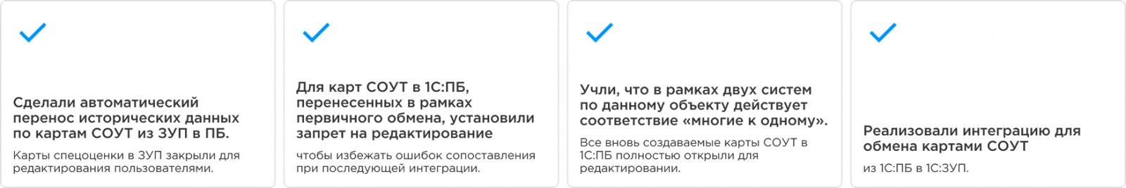 Для сохранения исторических данных учета мы реализовали механизм единоразового первичного обмена (получения данных в 1С:ПБ 1.1 из 1С:ЗУП) и интеграцию для взаимного обмена данными блока СОУТ.