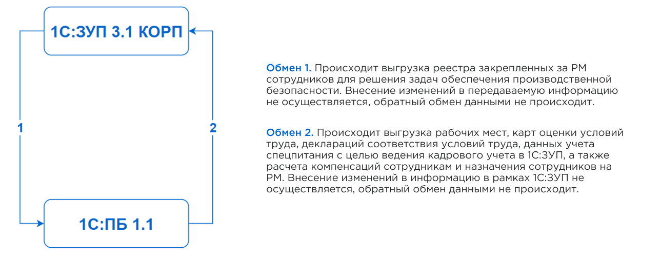 Другой пример — ВПФ для МО в 1С:ЗУП устанавливаются документом «Карта специальной оценки условий труда», а в 1С:ПБ — в рамках справочника «Рабочие места». Из-за этого на этапе проектирования нужно было произвести сопоставление данных и тщательно проработать архитектуру. Важно было не только настроить интеграцию, а сразу произвести перенос данных из системы в другую.