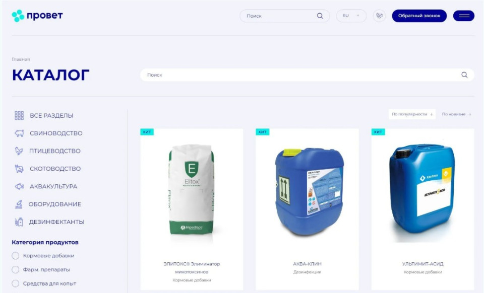 Дизайн портала был разработан с учётом нового брендбука: лёгкий, светлый интерфейс, акценты фирменного темно-синего цвета, адаптивная верстка, крупные шрифты и визуальная идентичность. Каталог был переработан: товары разделены по типам животных, форме препарата, производителю; реализованы мощные фильтры и кнопка запроса цены прямо из карточки. Пользователь может скачать актуальную инструкцию в PDF-формате, что важно для специалистов.