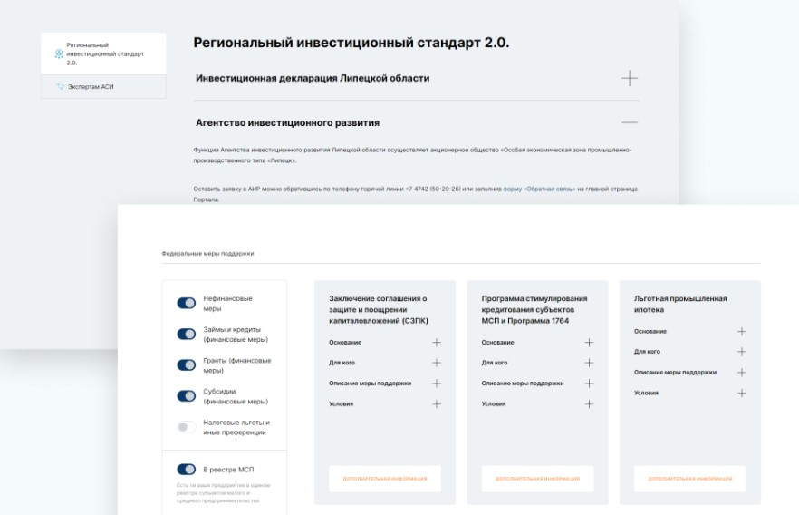 Это негативно сказывалось на выполнении важной задачи — на повышении инвестиционного рейтинга всей Липецкой области. При этом нужно учитывать, что площадка находится под контролем федеральных органов. Требования ведомств влияют на структуру и функционал площадки, их нужно заложить в техническое задание.