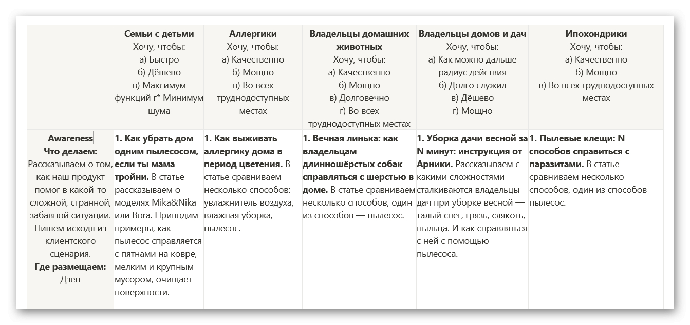 Это часть нашего контент-плана для клиента. Мы определили, что важно целевой аудитории, и разбили темы на пять блоков в зависимости от ЦА