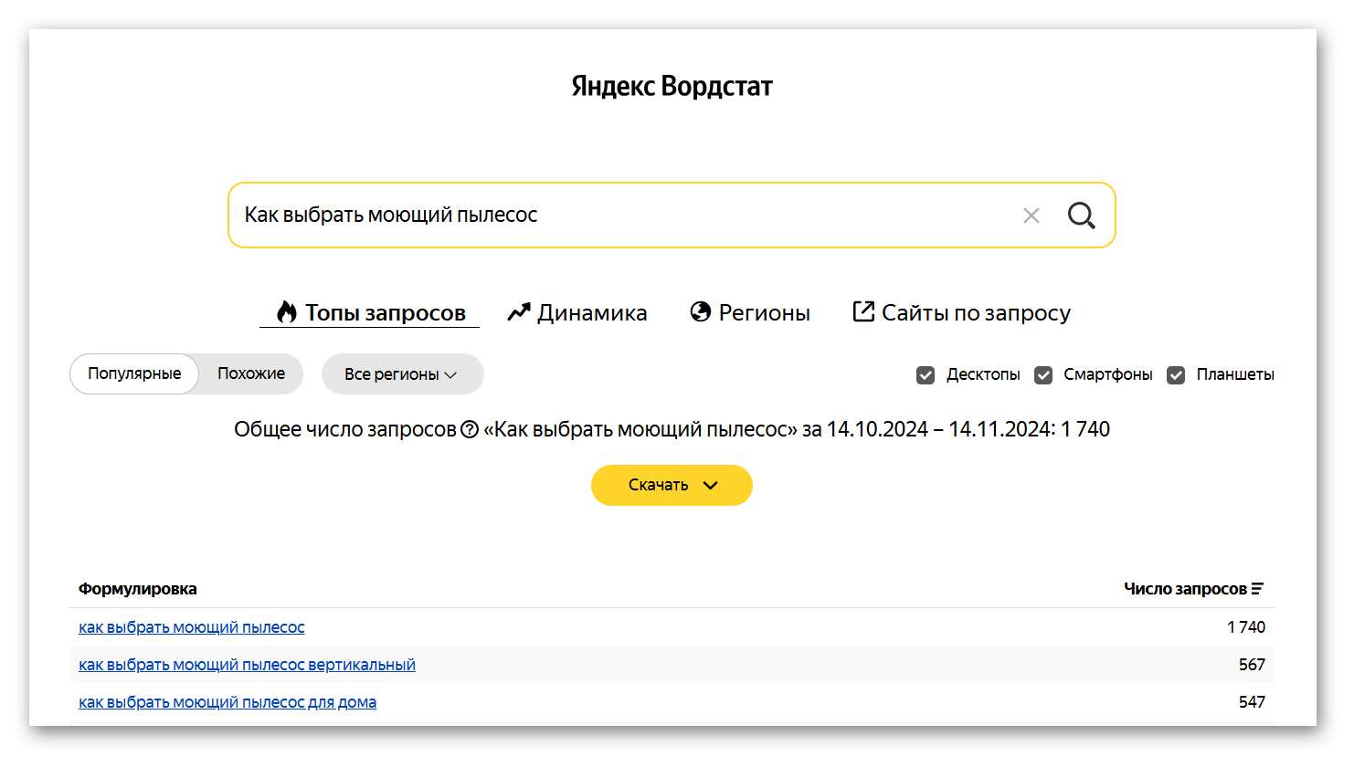 Темы для блога можно подобрать, например через Яндекс.Вордстат. Подумайте, что интересует потенциальных клиентов. Например, для производителя бытовой техники это могут быть ключевые запросы «Как выбрать моющий пылесос», «Лучшие пылесосы для дома», «Стоит ли покупать вертикальный пылесос».