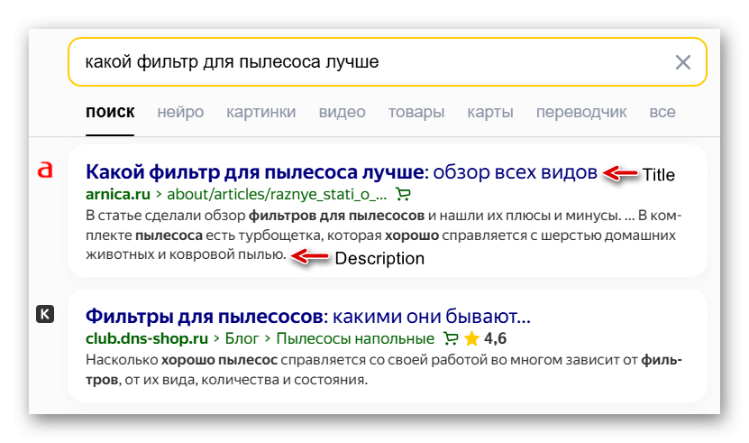 Например, мы написали для ARNICA статью «Аквафильтр или пылесборник? Обзор фильтров для пылесосов». По данным на ноябрь 2024 года, она стоит на первом месте выдачи Яндекса для Москвы по запросу «Какой фильтр для пылесоса лучше». Статью под SEO-ключи не оптимизировали — правда, когда размещали на сайте, прописали Title и Description с учетом ключевых запросов из Яндекс.Вордстата.