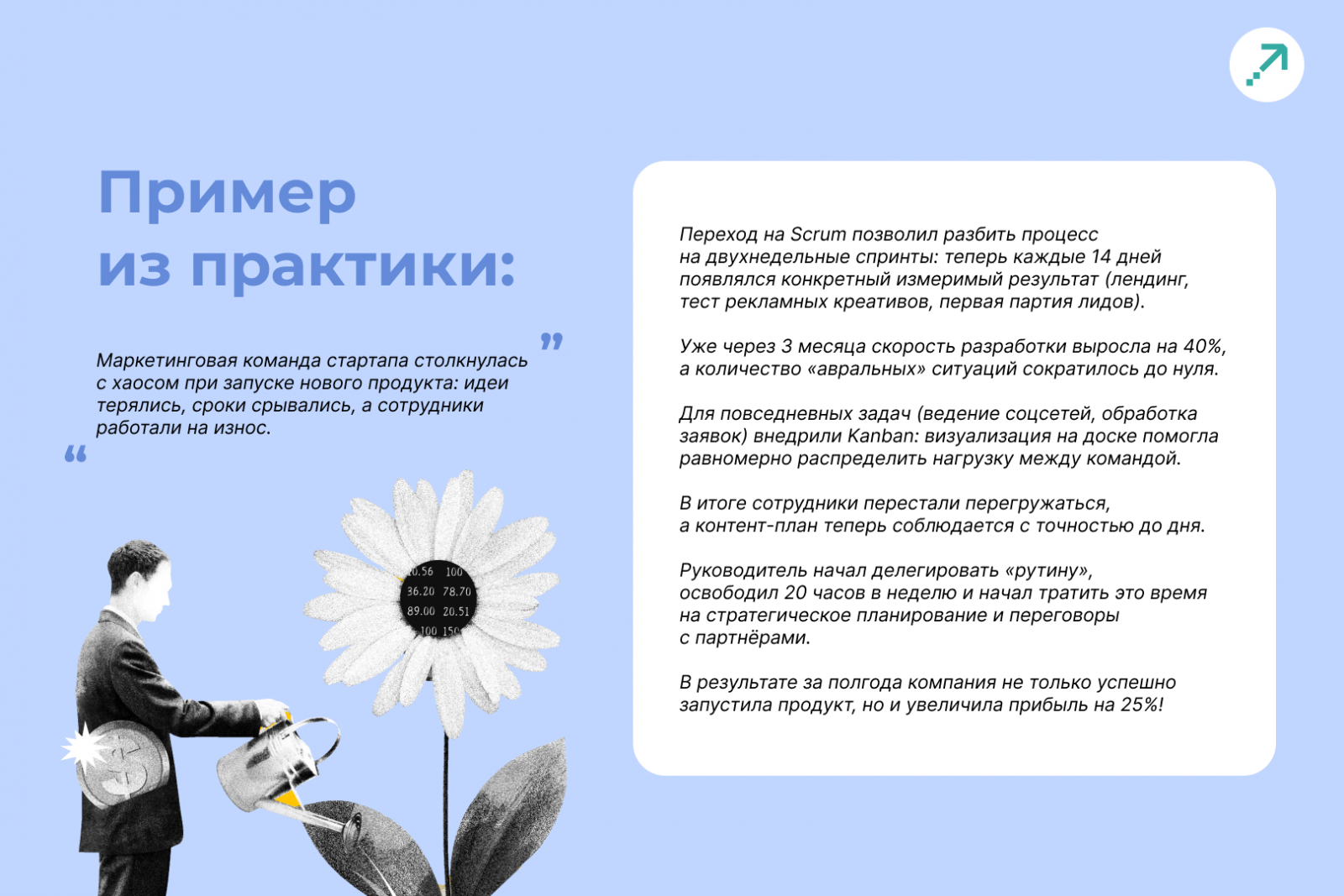 Вот реальная история: владелец онлайн-школы несколько лет жил в режиме «вечного тушения пожаров». После внедрения гибких методологий он не только разгрузил себя, но и наконец увидел четкую картину работы. Все задачи стали прозрачными, а приоритеты теперь определяет не срочность, а стратегическая важность.