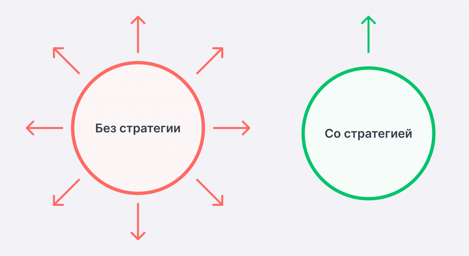 В таком случае у стратегии нет главного ее элемента — фокуса. Колесо, может, будет сбалансировано, но оно никуда не поедет, как телега в басне про лебедя, рака и щуку. Все направления будут тянуть одеяло на себя, у вас не появится четкого понимания, куда вкладывать бюджет, он будет равномерно распределяться, но колесо бизнеса останется на месте.