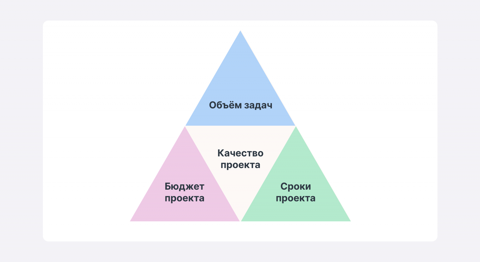 Опирается на проектный треугольник: качество результата складывается из бюджета (финансовых ресурсов, которыми компания располагает), сроков проекта (временных ресурсов) и скоупа работ — объема задач. Если нет хотя бы одного элемента или он оценен необъективно, план не будет выполнен. Например, если вы запускаете РК через директ, ставите цель по количеству лидов, пишете сроки, пошаговые действия, но не закладываете в бюджет стоимость работы команды, юнит-экономика может не сойтись, а цель в итоге не достигнется.