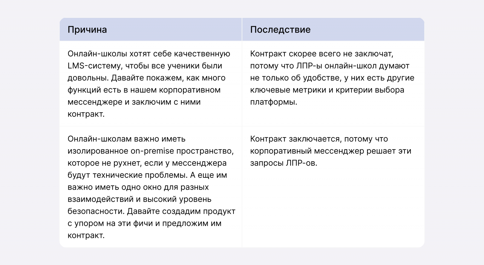 В этих двух примерах истинная первопричина онлайн-школы заключать договор — безопасность, единое окно и гибкость, а не просто удобство для учеников. Потому что потребности закрываются у ЛПР-ов, а не только конечных пользователей. Если ваша стратегия строится на первопричине, все ненужные действия сразу же отсекаются и становится ясно, как грамотно строить план и какие метрики успеха у него должны быть.