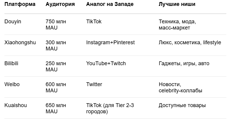 Основные: Douyin (TikTok), Xiaohongshu, Bilibili, Weibo