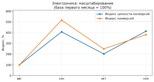 На графиках — реальные результаты из двух принципиально разных категорий: электроника (длинный цикл принятия решения, высокая цена ошибки) и гигиеническая продукция (импульсный спрос, высокая частота покупок). Мы сознательно показываем оба кейса, чтобы продемонстрировать: наши подходы к управлению трафиком работают независимо от поведения аудитории.