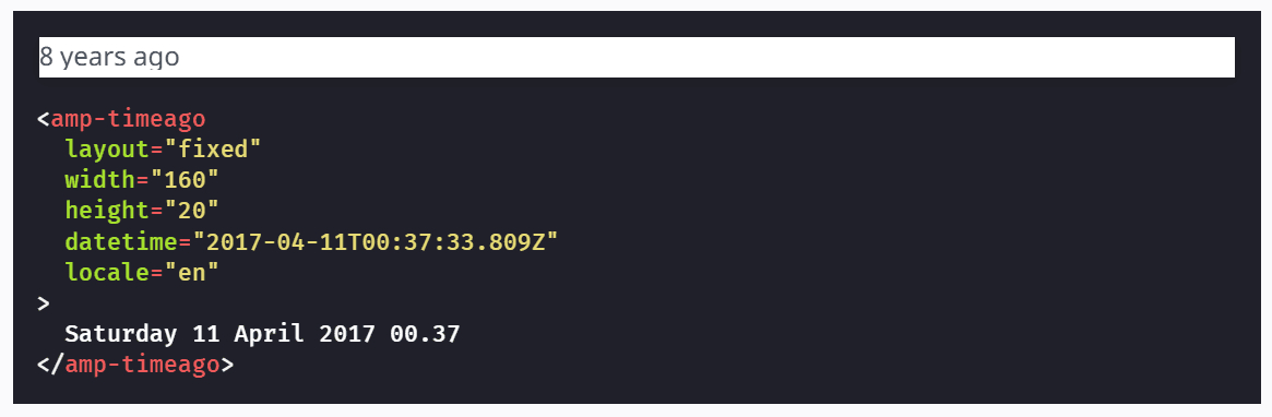 amp-timeago — это стандартный amp-компонент для отображения относительного времени в текстовом виде. Он выводит простые значения в зависимости от указанной даты, например, «через 16 часов», «через 3 месяца» или «через год».