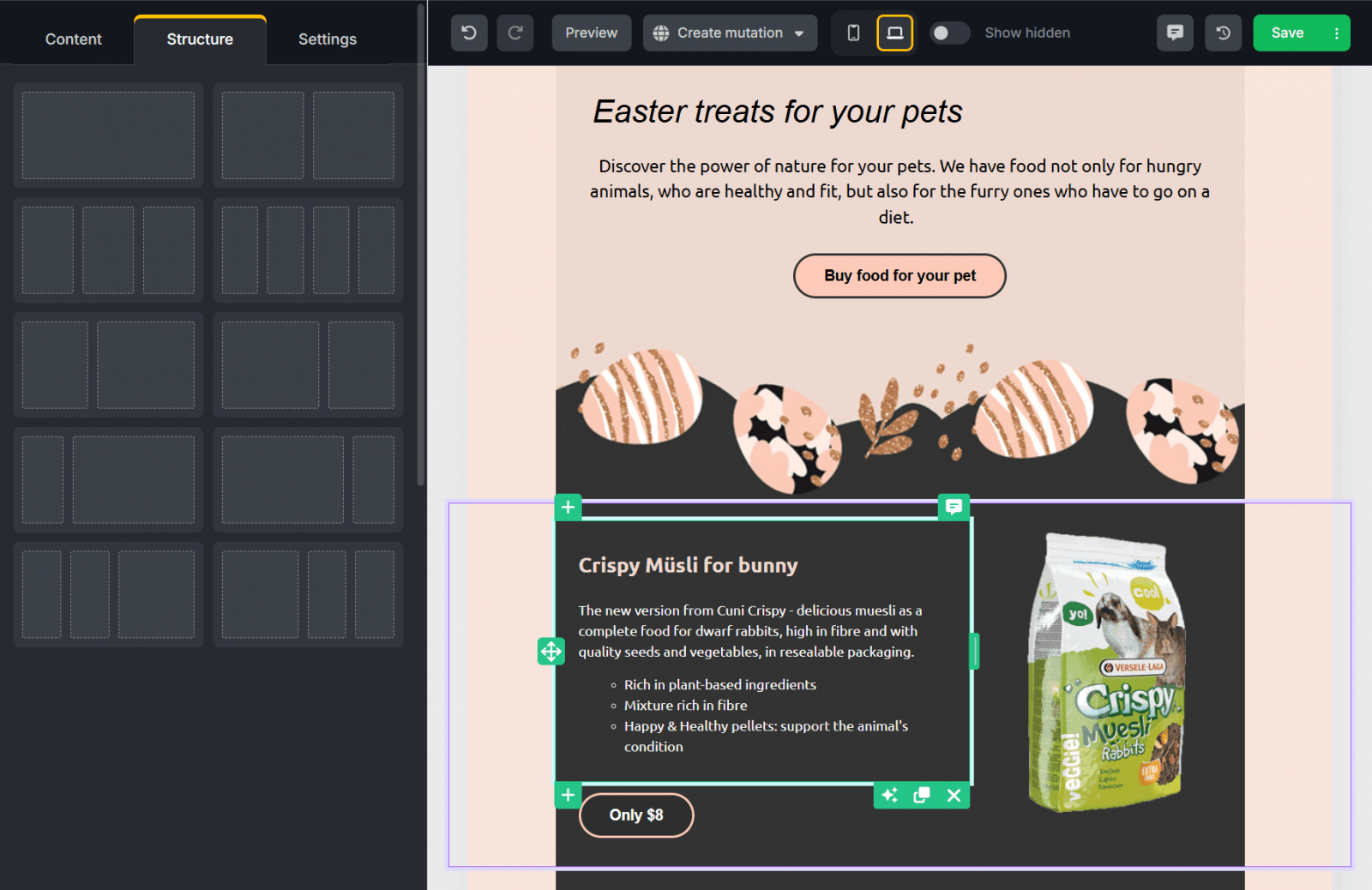Гибкость сохраняется независимо от того, создаёте ли вы письмо с нуля, собираете структуру из Готовых блоков или редактируете шаблон из галереи. Любую часть письма можно переработать под текущую задачу, в том числе добавлять или удалять элементы, настраивать их параметры, менять число колонок и многое другое.