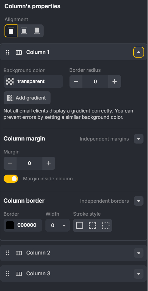 Поменять местами колонки здесь также возможно, но не в самом интерфейсе, а в настройках выбранной структуры. Свойства колонок (Column's properties) позволяют менять их расположение в ряду, а также устанавливать выравнивание, скругление, цвет фона и другие параметры.