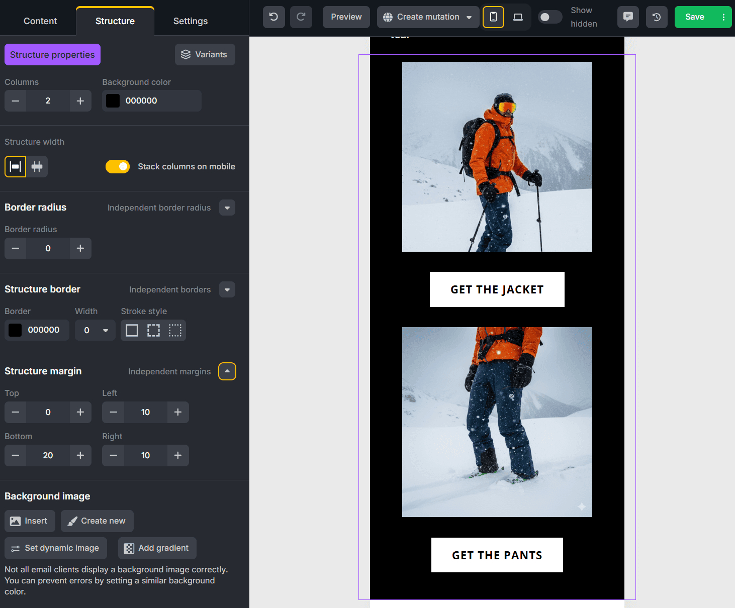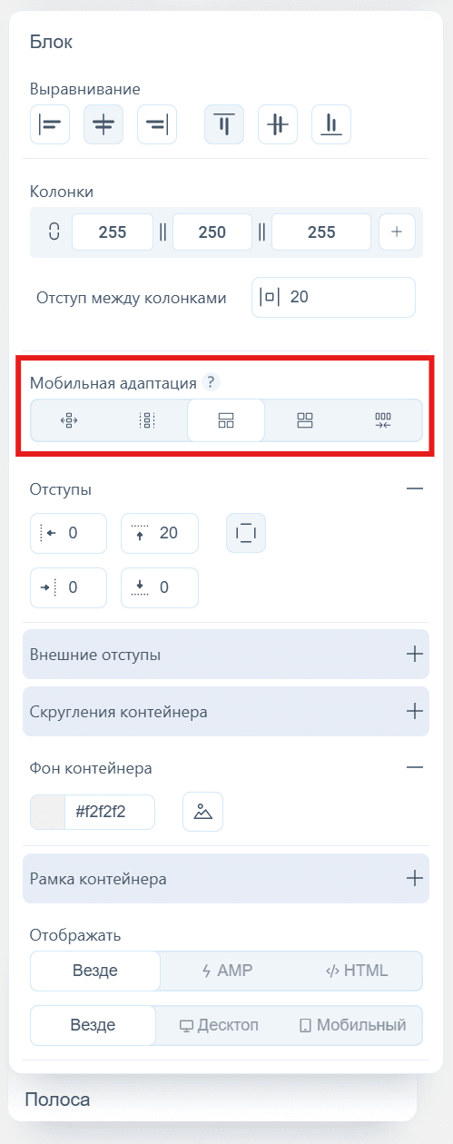В мобильном варианте письма используются два сценария отображения колонок: перестраивание или сжатие. Дополнительно функция «Fluid on mobile» в настройках изображений отвечает за их масштабирование под ширину экрана. Но более сложных схем для адаптации многоколоночных блоков редактор не предлагает.
