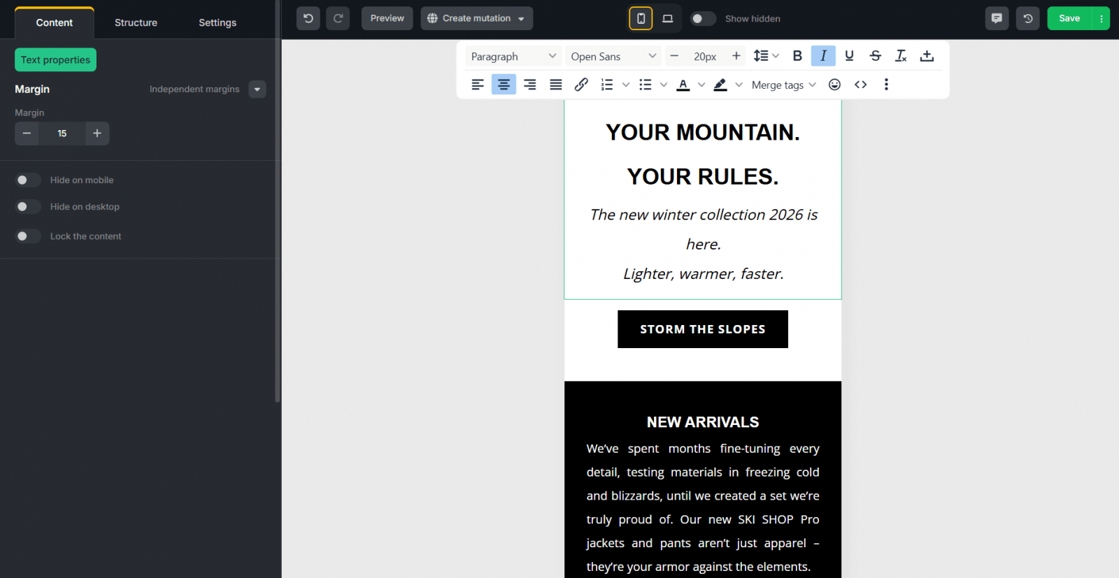 В TOPOL предпросмотр доступен в двух форматах: прямо внутри редактора и как отдельный режим с возможностью отправки тестового письма. Мобильную версию шаблона, как и десктопную, можно редактировать вручную. Следует учитывать, что изменения в одном варианте письма синхронно применяются к другому.