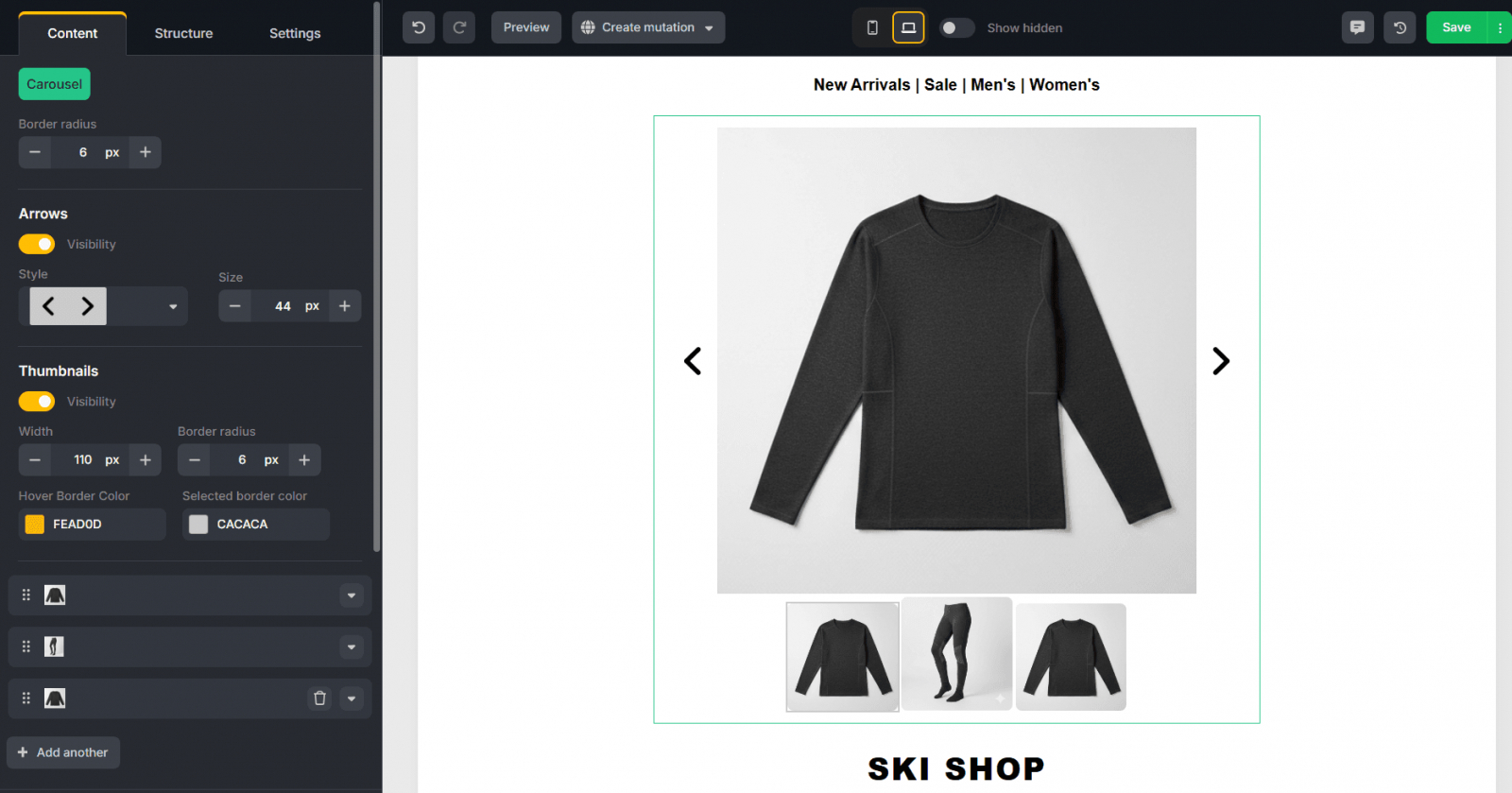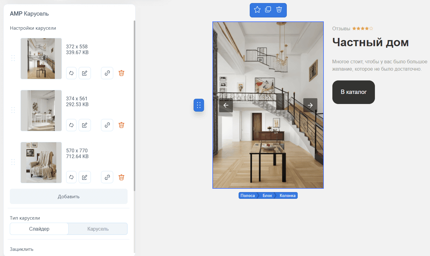 В конструкторе TOPOL на момент публикации статьи реализована только бета-версия карусели с поддержкой до пяти изображений. Доступны настройки стрелок переключения, галереи изображений, отступов и других параметров, но отсутствуют автопрокрутка и зацикливание. Информации о том, планируется ли в будущем добавление новых AMP-компонентов, TOPOL на текущий момент не предоставляет.