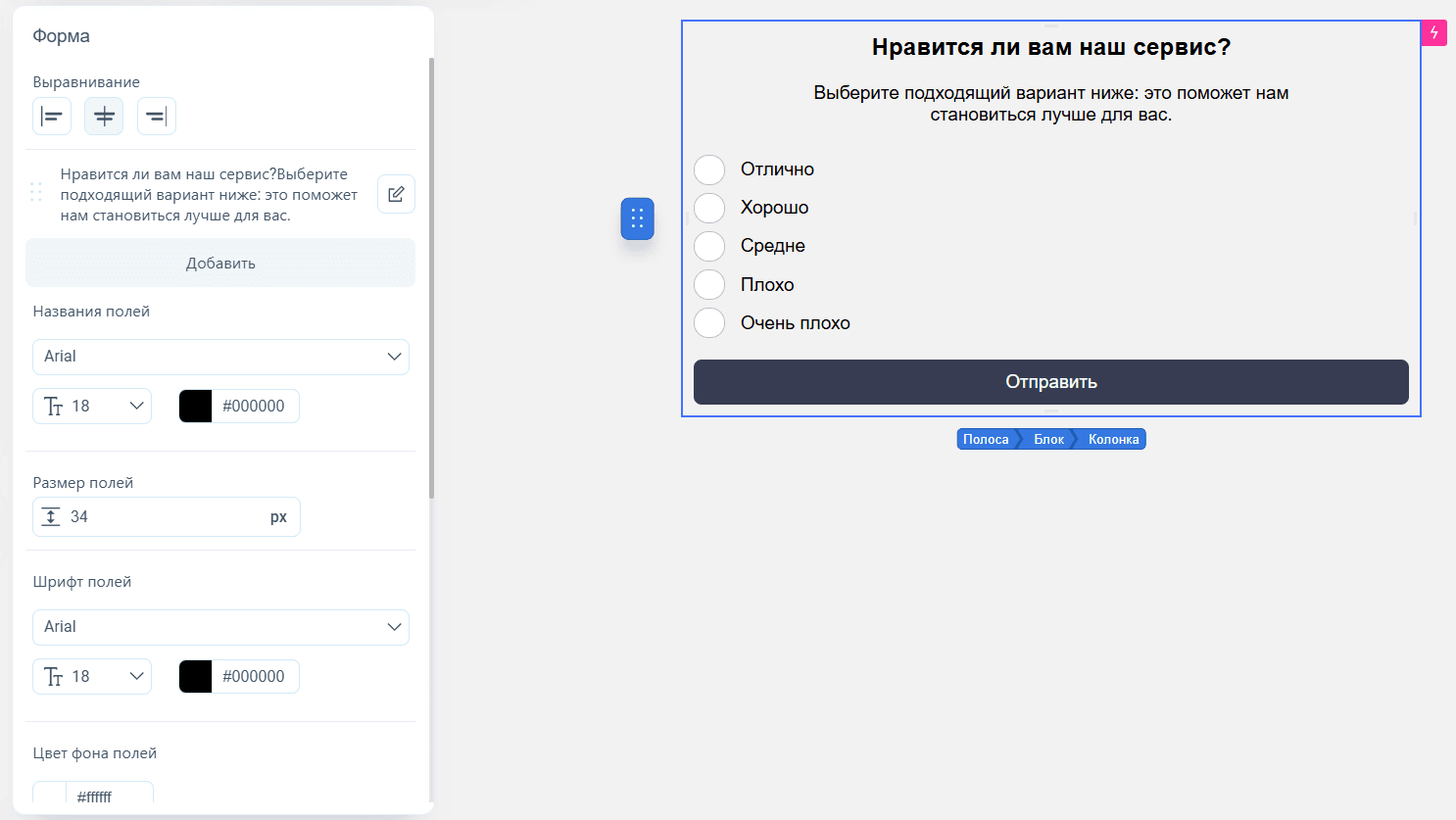Помимо карусели Pixcraft предлагает AMP-формы с гибкой настройкой: от типа полей (ввод текста, одиночный или множественный выбор) до визуального оформления. Формы и Карусель доступны как Примитивы прямо в интерфейсе конструктора.