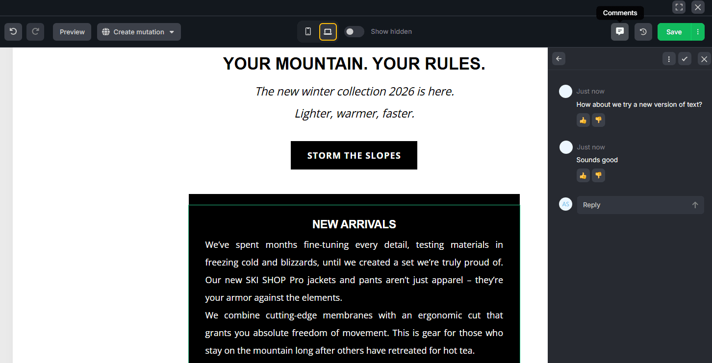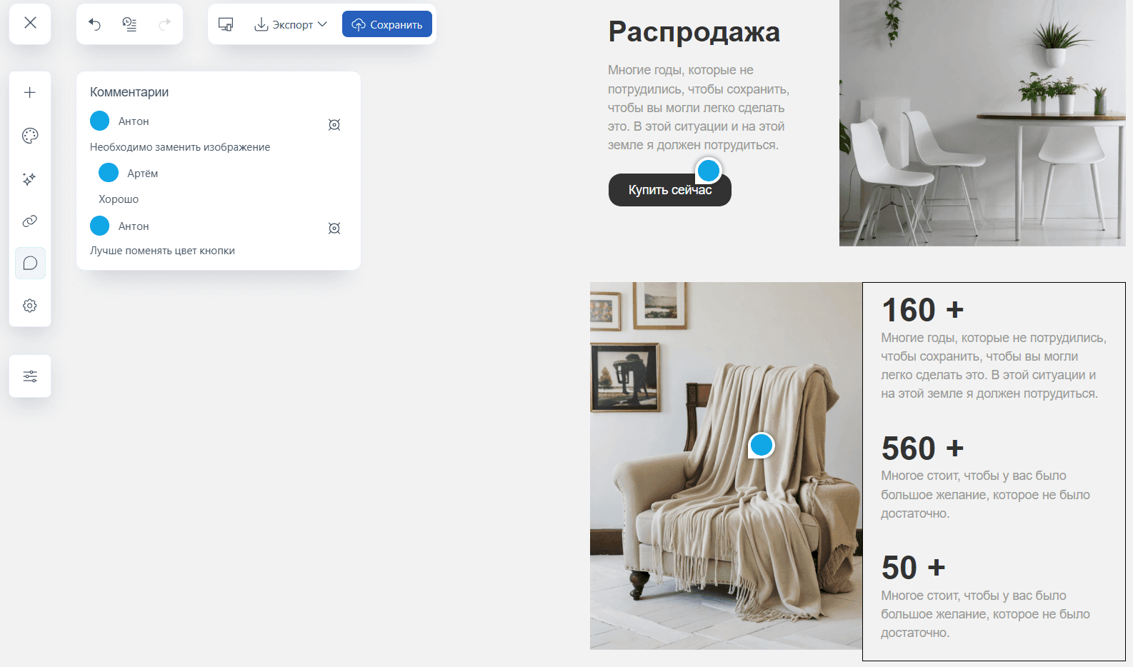 Визуально редактор не даёт понимания того, на каких именно элементах есть комментарии. Для их отображения используется функция Comments в правом верхнем углу: она выводит полный список комментариев и по наведению курсора подсвечивает элементы, к которым они относятся.