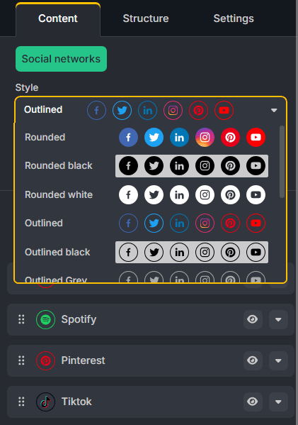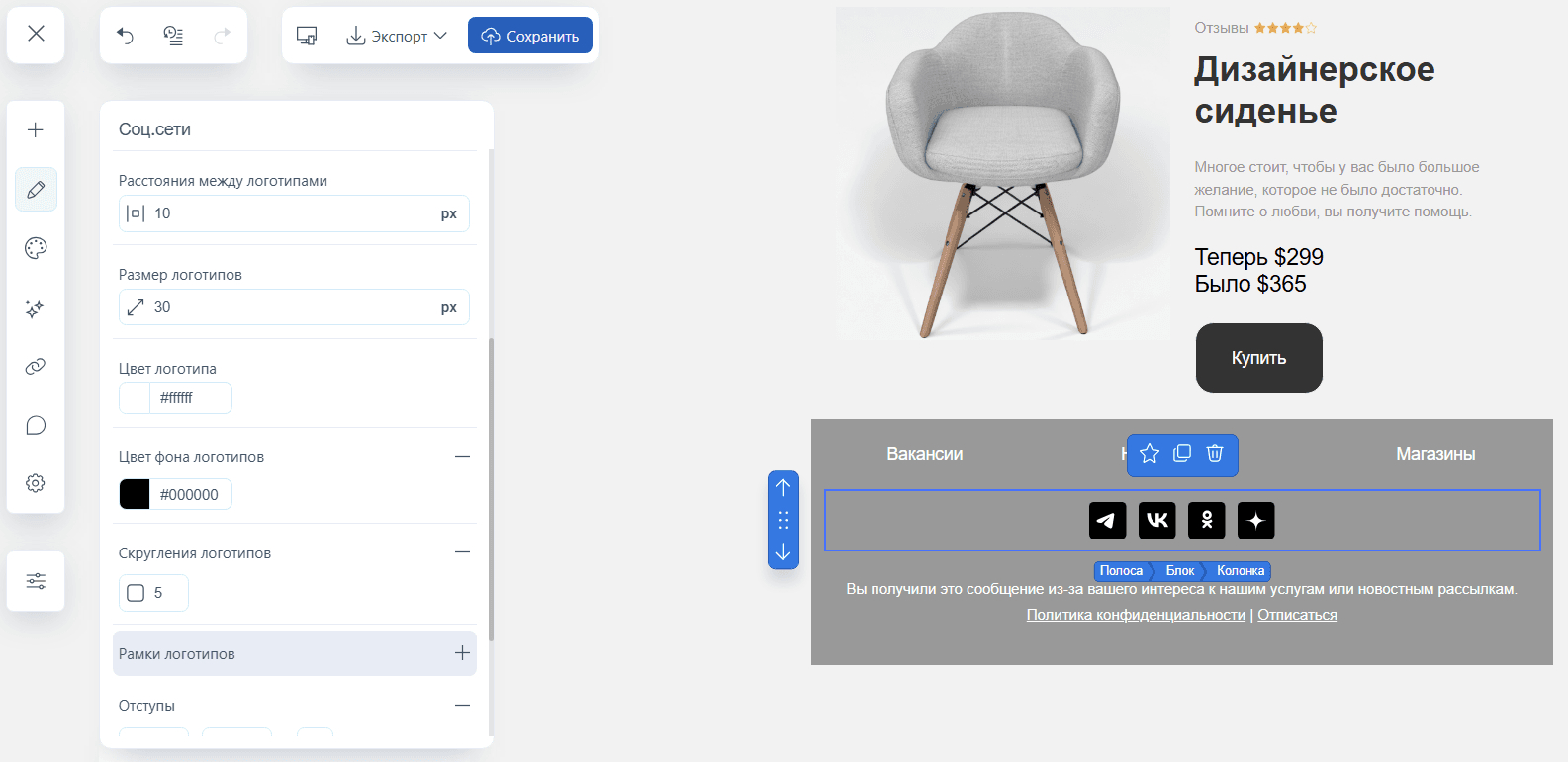 По-разному выстраивается и работа с иконками соцсетей. Конструктор TOPOL содержит набор готовых стилей иконок, но если требуется индивидуальное оформление, их придётся создавать и добавлять вручную. Штатные настройки ограничены лишь базовыми параметрами, такими как размер, выравнивание и расстояние между иконками.