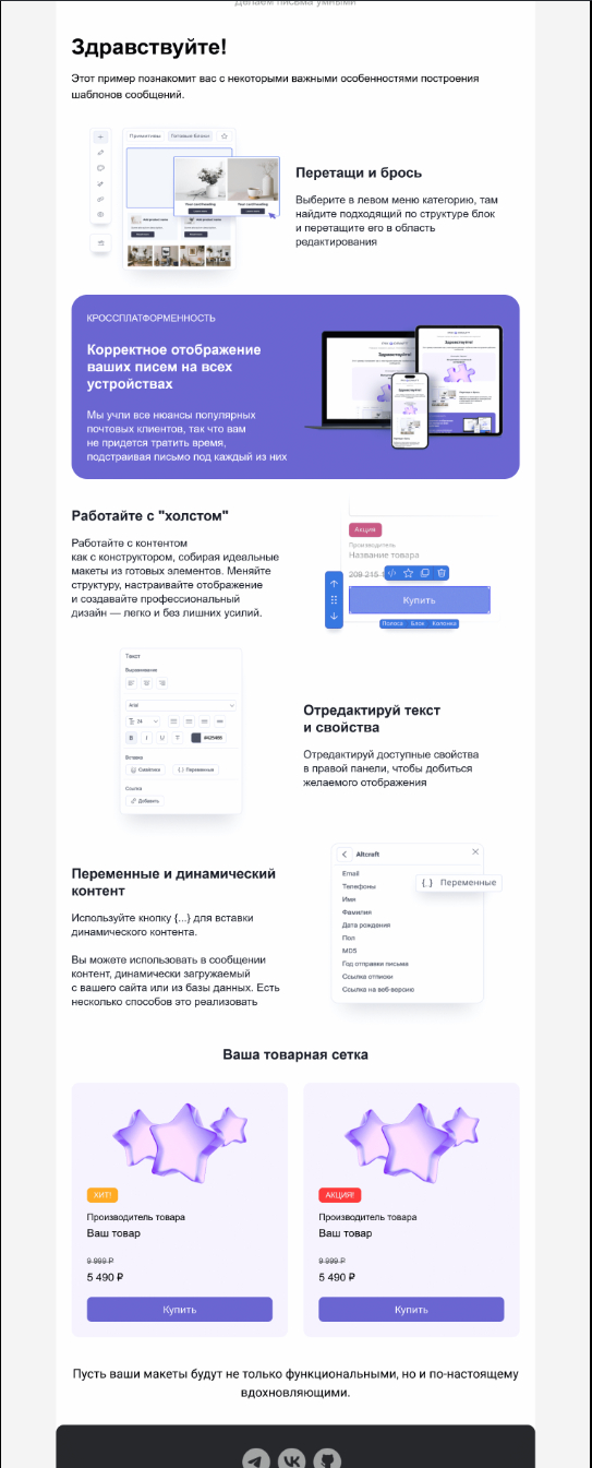 Каркас письма в Pixcraft создаётся с помощью Примитивов либо Готовых блоков. Примитивы представляют собой отдельные элементы, такие как текст, изображения или интерактивные компоненты, а Готовые блоки — это заготовленные функциональные блоки из нескольких Примитивов: шапки, подвалы, карточки товаров и так далее.