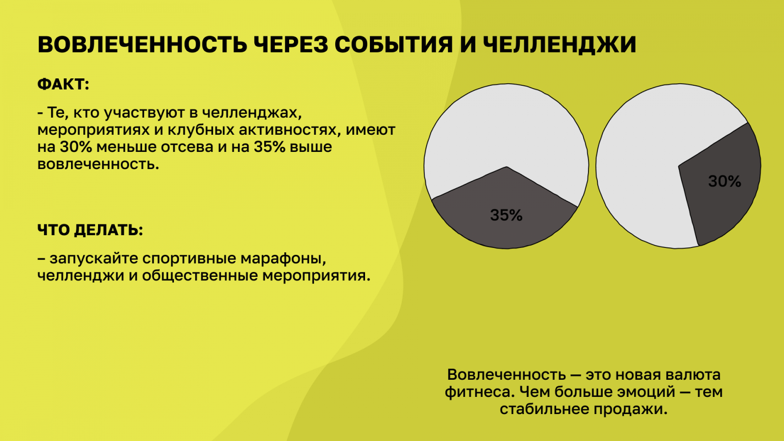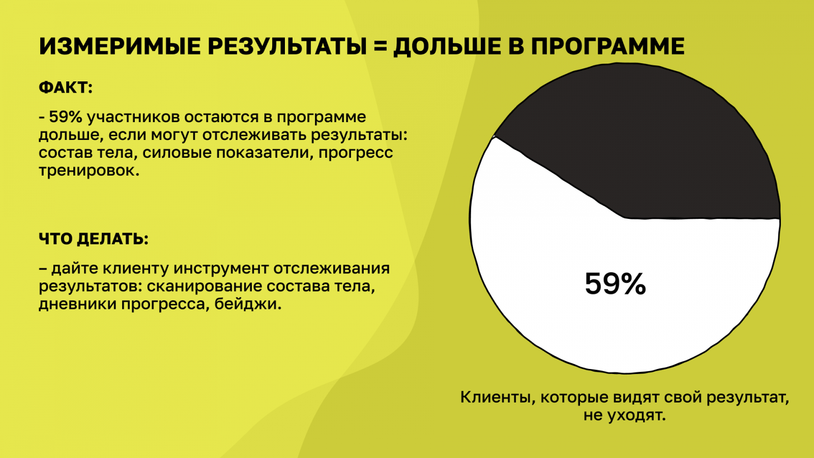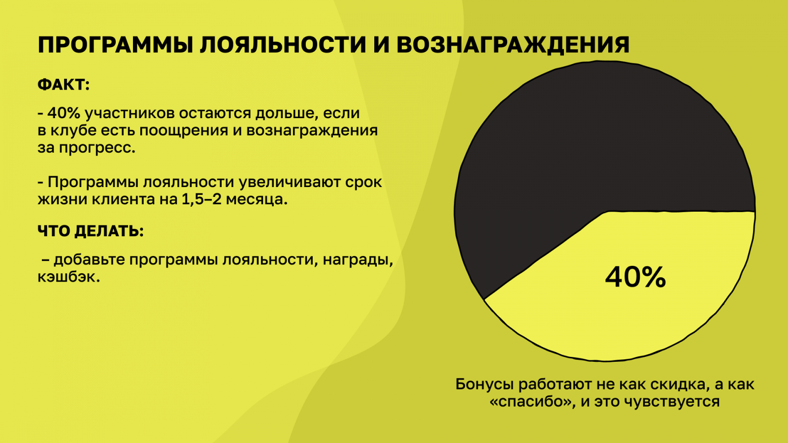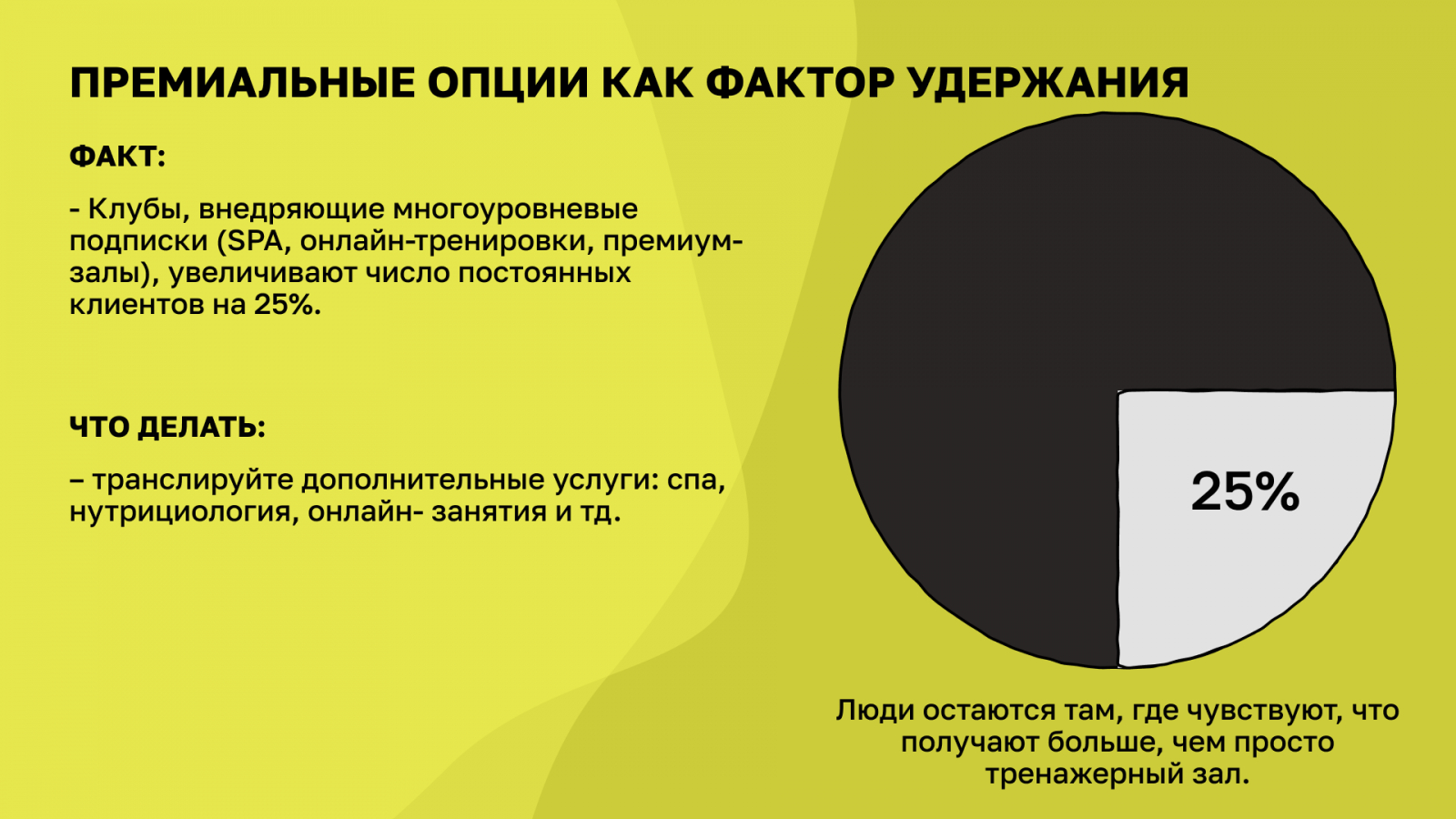 Если спросить, чем ваш клуб отличается от соседнего, скорее всего речь пойдет о заслуженных тренерах, определенном вайбе и людях, которые разделяют ваши ценности. Но вот вам несколько цифр из исследования Smart Health Clubs, которыми можно оперировать при построении других добавочных ценностей. Именно они позже легли в основу механик, которые мы покажем дальше.