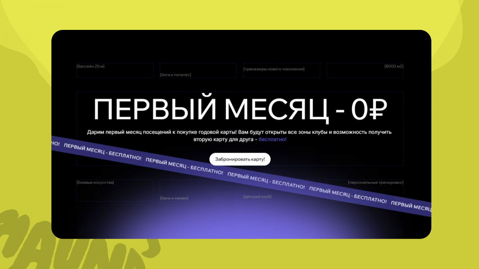 Задача первого экрана — поймать человека и показать, что он пришел по адресу. Если человек ищет фитнес — он должен понять это за 2 секунды.