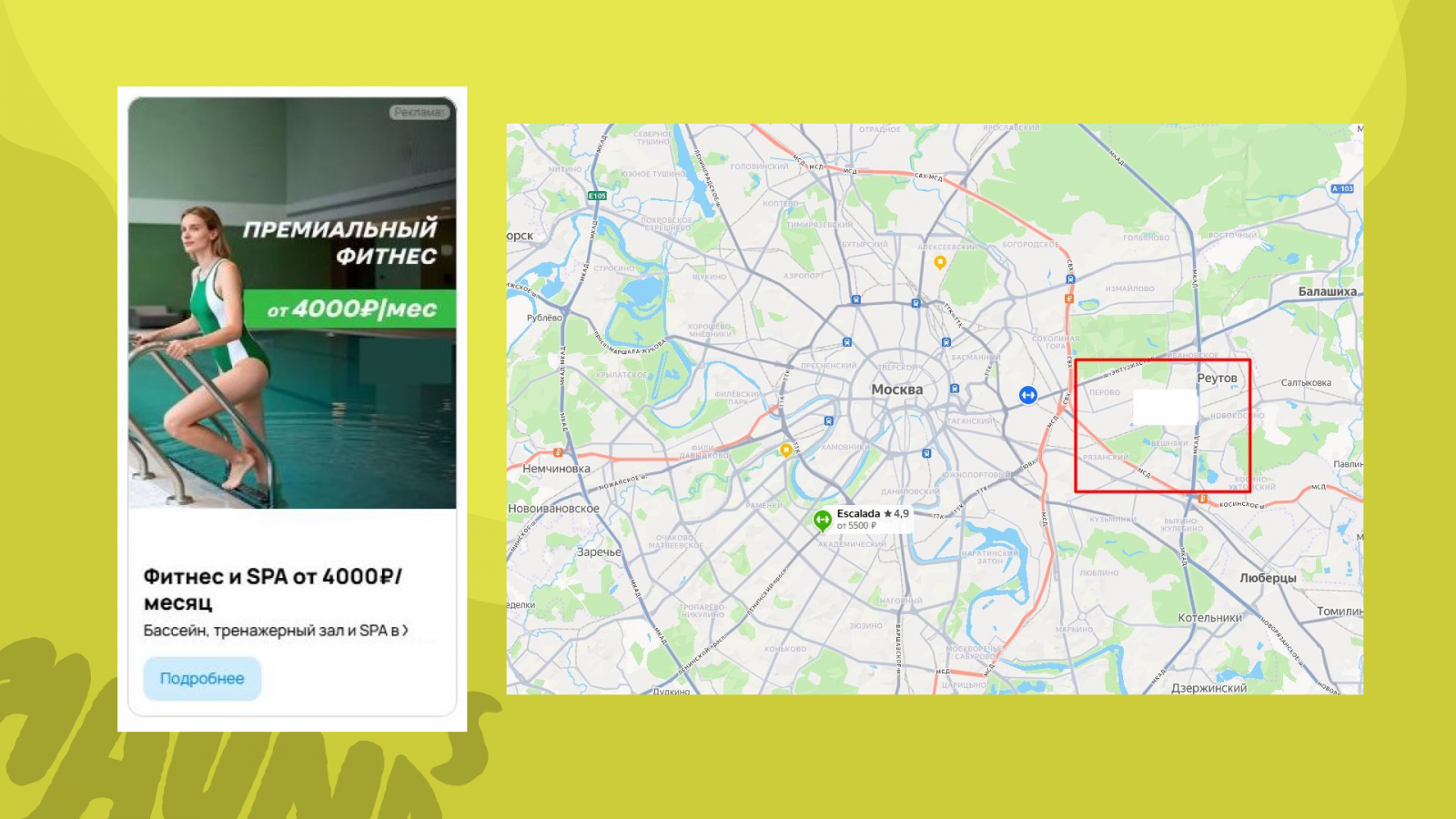 Авито не дает выбрать конкретный район. Реклама крутится на весь город. Для фитнес-клуба формата «у дома» в миллионнике это беда: человек из Бутово видит рекламу клуба на Соколе и справедливо думает, мол, ну нафиг, это же час в дороге. Кстати, именно по этой же причине чаще всего Авито подходит только регионам.