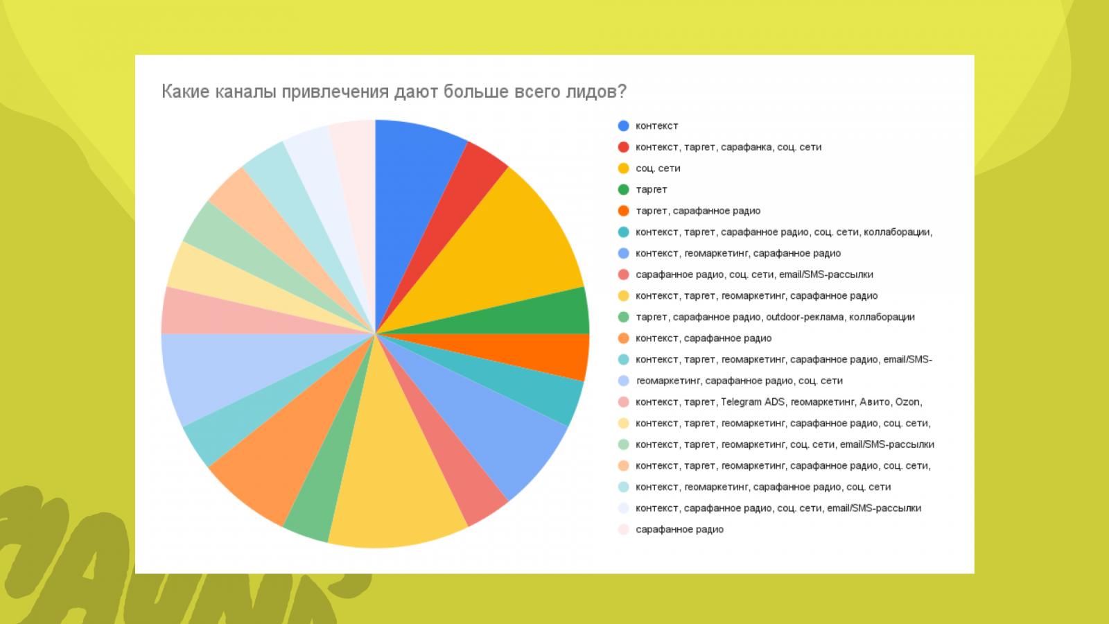 Сарафанное радио — упоминается почти в каждом ответе, но как дополнительный источник. Соцсети без таргета — многие пишут, но оценить, что они там делают, мы не можем.
