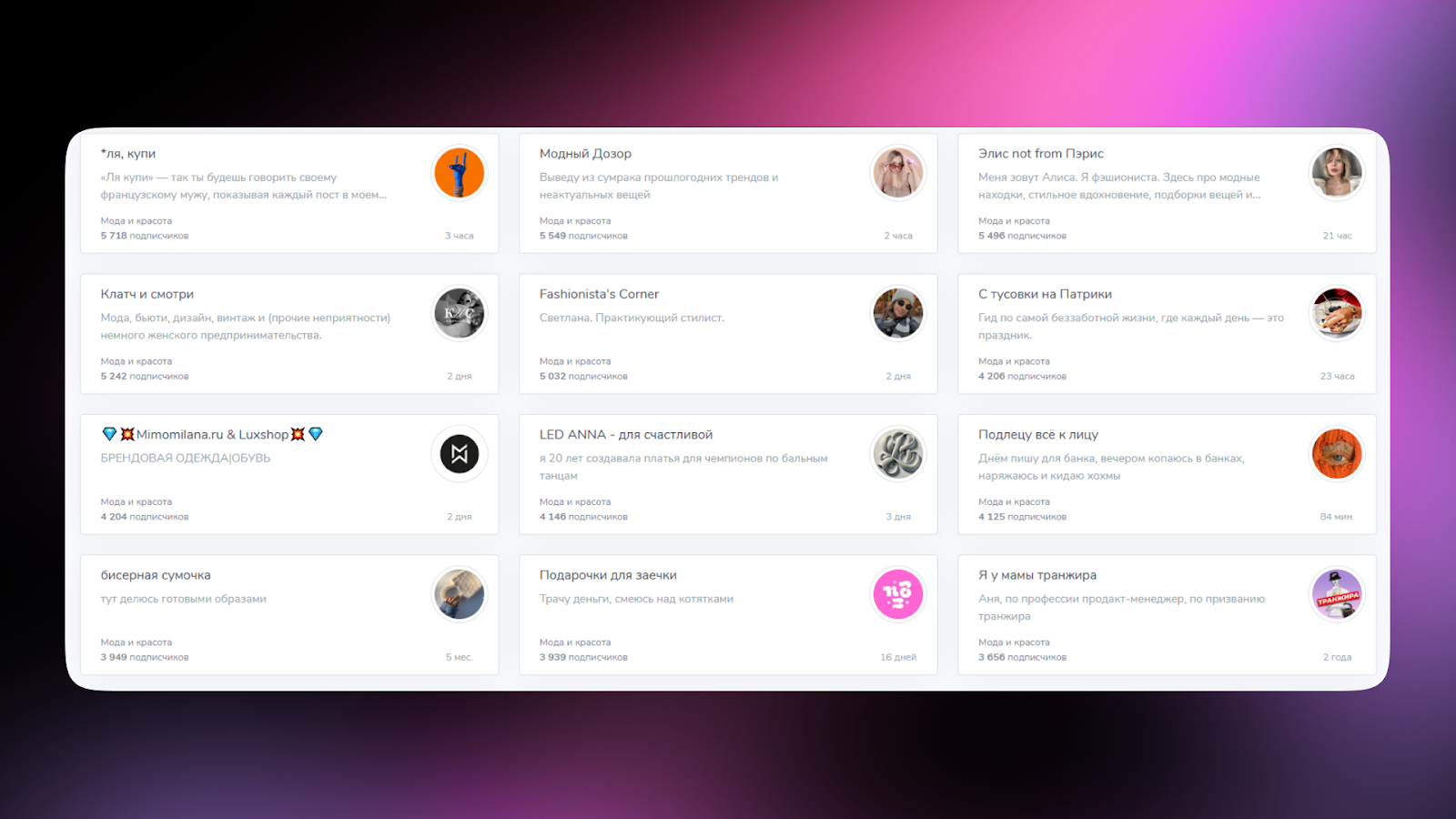 Мы проанализировали сотни каналов и отобрали самые интересные и полезные. Узнайте, какие блогеры диктуют тренды, делятся лайфхаками и помогают создать свой уникальный стиль.