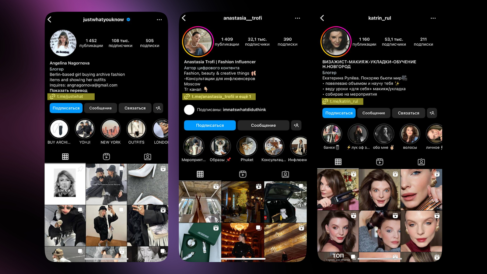 Многие влиятельные персоны в сфере моды присутствуют не только в Telegram, поэтому мы расширили наш поиск на другие популярные социальные сети и платформы. Там блогеры часто в описании своих страниц оставляют ссылки на tg-каналы, которые нас и интересовали.