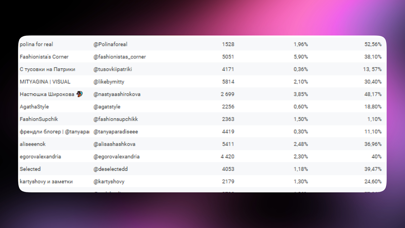 Нашей целью было найти именно персональные каналы, где за контентом стоит личность, а не безликий бренд или новостная лента. Например, эксперты, стилисты, инфлюенсеры, которые делятся личным опытом, трендами и советами.