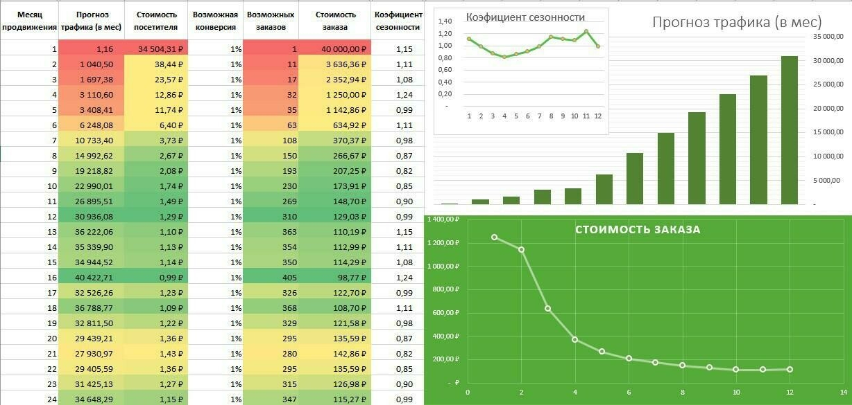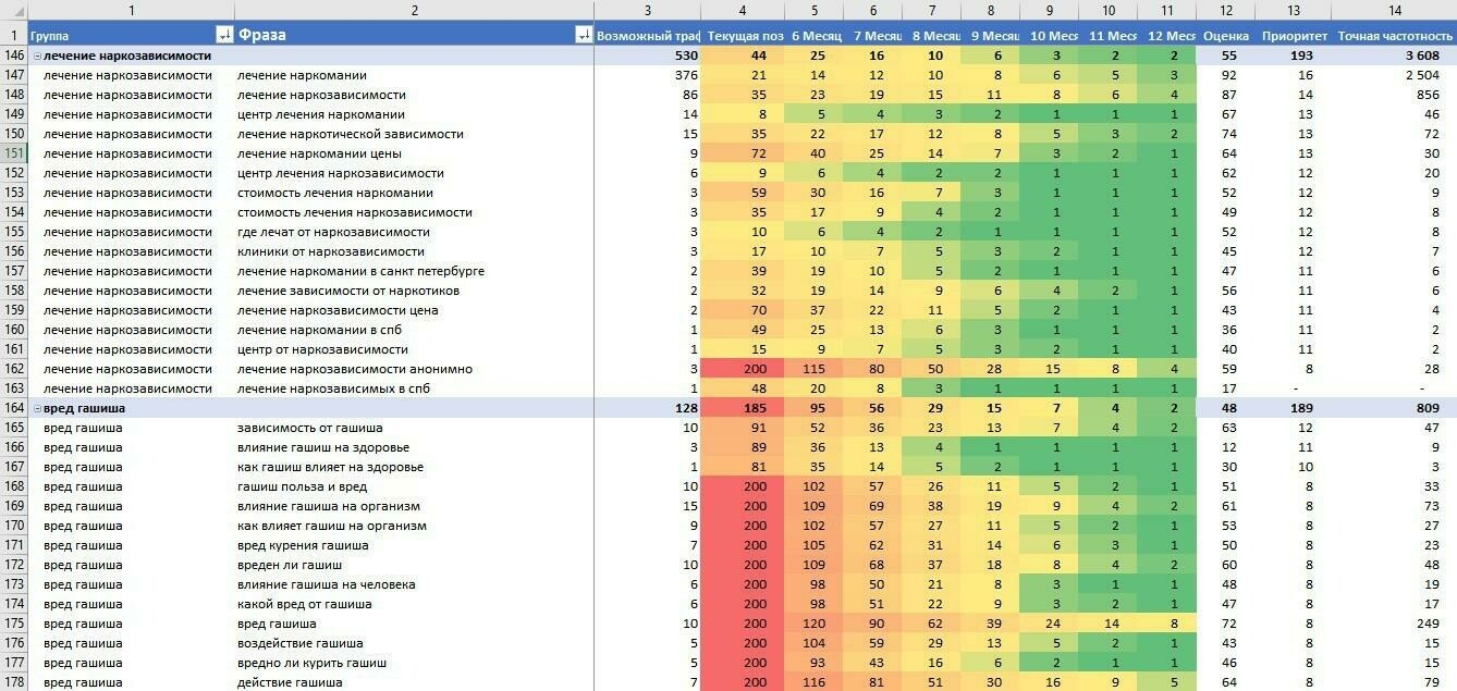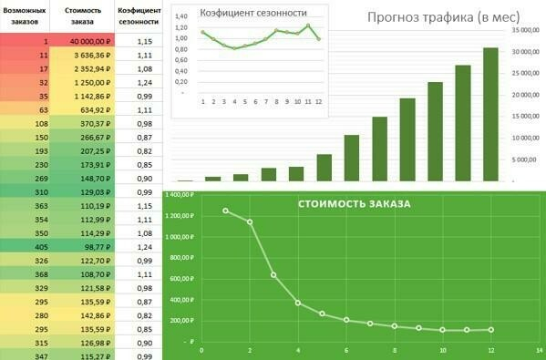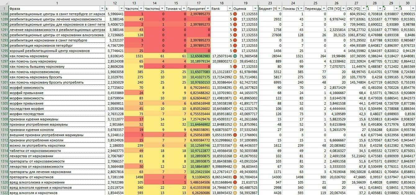 Если простым языком — это анализ каждого запроса по десяткам параметров с помощью математических формул. Цель — спрогнозировать будущий трафик и количество продаж, а также выделить среди запросов самые эффективные и начать работы именно с них. Кроме этого, при формировании очередности работ учитывается важность и маржинальность различных групп товаров или услуг — наиболее маржинальные и важные для бизнеса направления продвигаются в первую очередь.