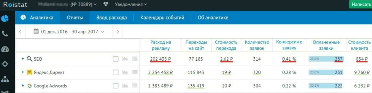 Интернет-магазин раций. В таблице ниже отражен анализ каналов рекламы сайта. Поисковый трафик самый выгодный для этого клиента (подчеркнуто красным). Расход на работы по SEO ниже расходов на Яндекс.Директ в 11 раз, стоимость перехода на сайт ниже в 7 раз, у SEO-трафика лучшая конверсия и он дает больше всего оплаченных заявок по самой низкой цене — стоимость клиента 854 рубля, что ниже стоимости клиента из Яндекс.Директ в 11 раз.