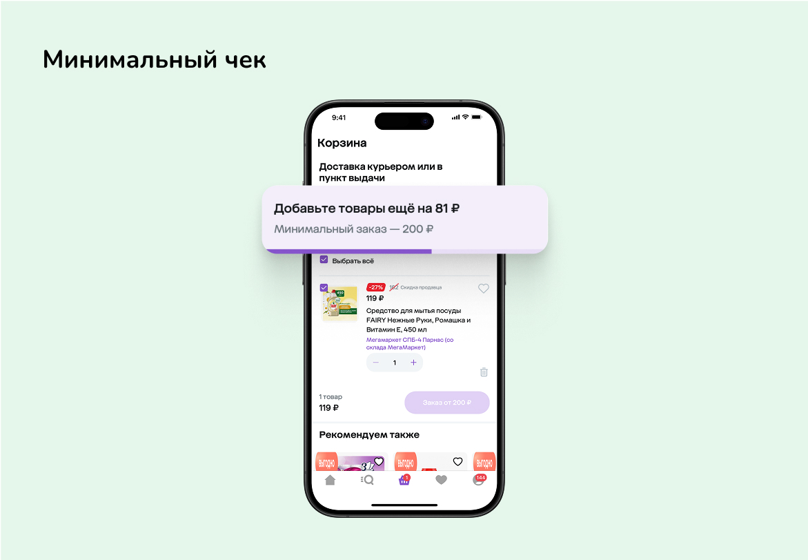 Минимальный порог для бесплатной доставки давно используется в e-commerce, но в мобильных приложениях он работает ещё лучше за счет моментального эффекта. Такое ограничение мотивирует пользователей класть в корзину больше, чем они планировали, и тем самым увеличивая AOV (average order value или средний чек).