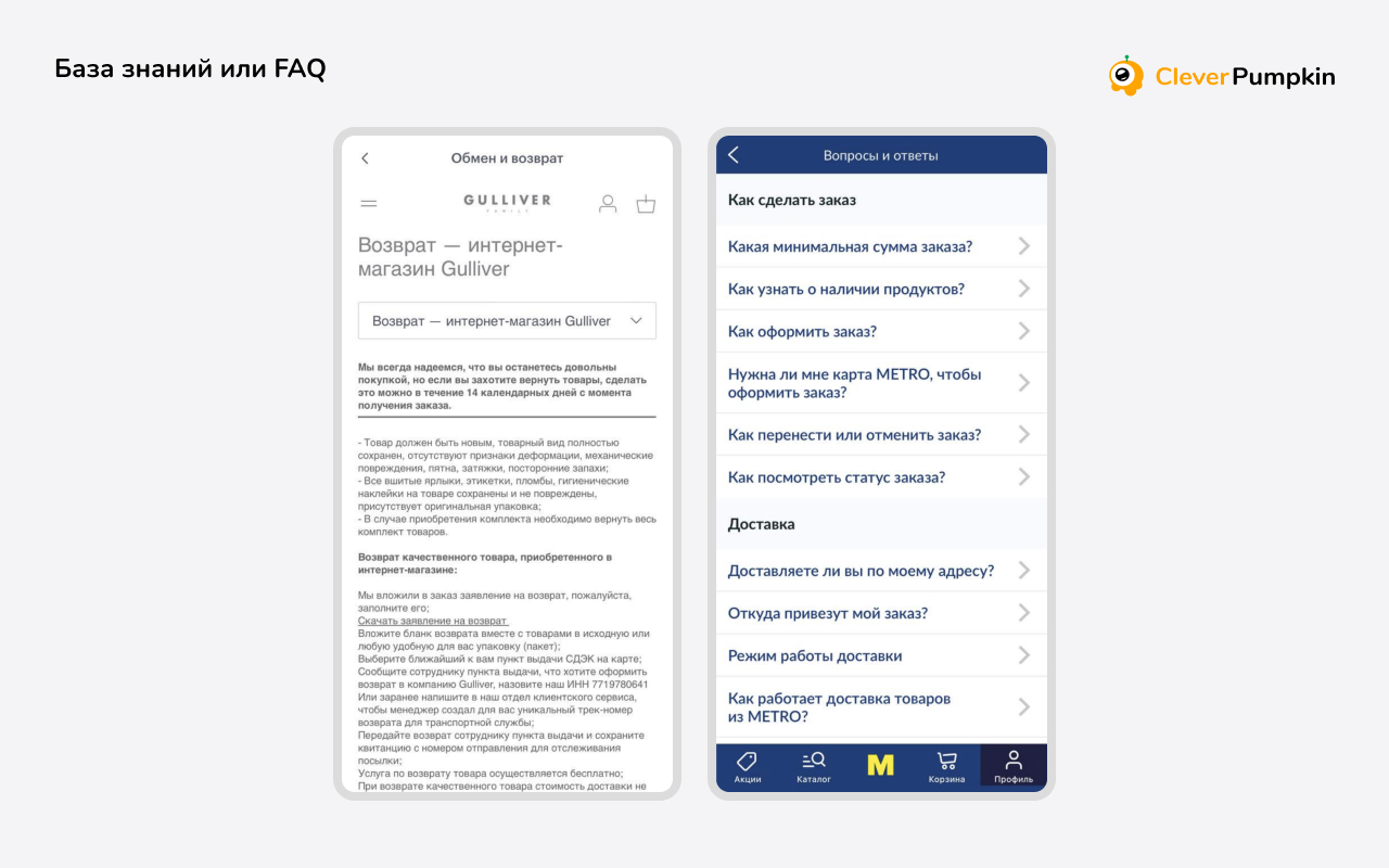 Важно регулярно обновлять базу знаний, особенно в e-commerce, где часто меняются акции, условия доставки и оплаты.