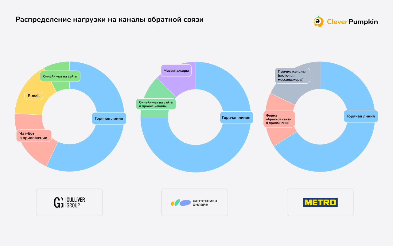 Эксперты «Сантехника-Онлайн», METRO и Gulliver Group единогласно отмечают колл-центр самым загруженным каналом связи. Например, в METRO на телефон приходится 66% всех обращений. На горячую линию сети магазинов детской одежды Gulliver поступает около 52% обращений от покупателей.