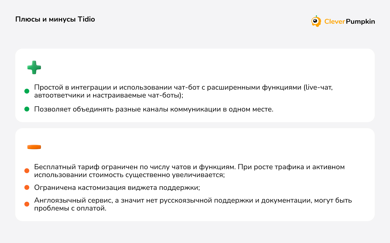 Tidio — один из самых популярных чат-ботов, который можно быстро внедрить и интегрировать с e-commerce платформами. Помимо этого, в сервисе доступны инструменты для email-маркетинга и тикет-систем.